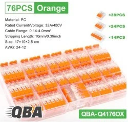 Wielorazowego zastosowania szybkozłączki instalacyjne Safe QBA zapakowane 76szt w wygodnym pudełku stosowane są przy łączeniu przewodów elektrycznych w puszkach elektroinstalacyjnych, w maszynach, w lampach, szafkach rozdzielczych i innych pracach elektroinstalacyjnych nawet nisko prądowych. Zalety szybkozłączki QBA: stabilne i mocne połączenie, przeźroczysty korpus pomaga kontrolować prawidłowe ułożenie przewodów wewnątrz, małe rozmiary obudowy, które ułatwiają ułożenie przewodów wszechstronne zastosowanie od 0.14 do 4mm2 drutu przyśpiesza prace instalatorskie wytrzymałe dźwignie o prostej i niezawodnej konstrukcji zapakowane w wygodny organizer Dane techniczne: Kolor: pomarańczowy i transparentny Przekrój stosowanych przewodów: 0.14 ~ 4mm2 linka / drut Łączna ilość zacisków: 2,3,5 Ilość elementów w opakowaniu: 76szt: 38szt x 2 | 23szt x 3 | 14szt x 5 Zakres obciążenia: 32A Napięcie znamionowe: 450V Długość odizolowania przewodu: 11mm Norma: EN 60998-2-2