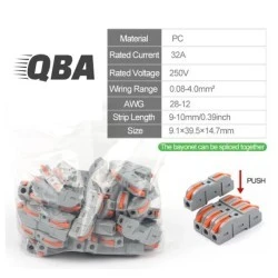 Wielorazowego zastosowania szybkozłączki instalacyjne Safe QBA QNC221 stosowane są przy łączeniu przewodów elektrycznych w puszkach elektroinstalacyjnych, w maszynach, w lampach, szafkach rozdzielczych i innych pracach elektroinstalacyjnych nawet nisko prądowych. Zalety szybkozłączki QBA: stabilne i mocne połączenie, małe rozmiary obudowy, które ułatwiają ułożenie przewodów wszechstronne zastosowanie od 0.08 do 4mm2 drutu przyśpiesza prace instalatorskie wytrzymałe dźwignie o prostej i niezawodnej konstrukcji sprzedawane luzem materiał obudowy wykonany z niepalnego tworzywa możliwość łączenia złączy w jedną szynę Dane techniczne: Kolor: szary Przekrój stosowanych przewodów: 0.08 ~ 2.5mm = 2 linka / 0.08 ~ 4mm = drut Łączna ilość zacisków: 2 Ilość elementów w opakowaniu: 100szt Zakres obciążenia: 32A Napięcie znamionowe: 250V Długość odizolowania przewodu: 9mm Funkcja: 1 x wejście, 1 x wyjście Opakowanie: worek foliowy Norma: EN 60998-2-2