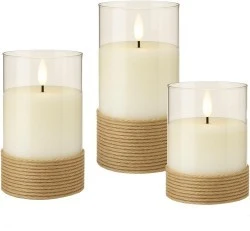 - Stylowe świece filarowe w trzech różnych rozmiarach z naturalnie wyglądającym, migoczącym płomieniem w przezroczystym szkle, owinięte konopiami – całkowicie elektryczne i całkowicie bezpieczne