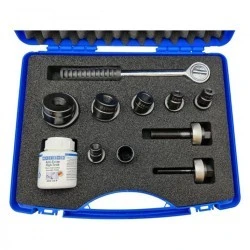 Mechaniczny zestaw walizkowy wycinaków ENERGOTYTAN POLSKA W102 służy do wycinania otworów okrągłych w stali zwykłej pod dławiki, przyciski, oświetlenie sygnalizacyjne, przyrządy pomiarowe, przepusty kablowe, itp. Dwa ostrza tnące umieszczone są symetrycznie co umożliwia idealne i bezproblemowe wycięcie otworu bez jego dalszej obróbki.