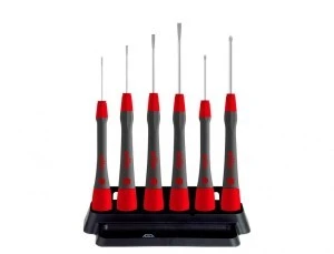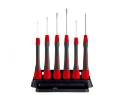 Ergonomiczne wzornictwo rękojeści ze strefą miękką zapewnia komfort pracy. Pełne wyczucia i szybkie obracanie wspomagane jest przez kołpak obrotowy poruszający się bez oporu. Ponadto nadrukowane na kapturkach obrotowych wkrętaków symbole ułatwiają wybór wkrętaka o właściwym profilu. Zestaw zawiera 6 wkrętaków precyzyjnych PicoFinish® i uchwyt. W tym ostatnim można wygodnie przechowywać wkrętaki precyzyjne na stanowisku pracy.