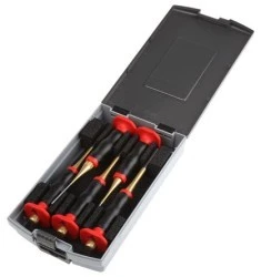 DIN 6450. Zestaw 5-elementowy pinowych punktow. Równoległe, lakierowane punktaki sworznia z osłoną rąk Zestaw 5 sztuk, rozmiary 2 → 6 mm Dostarczany w plastikowej obudowie