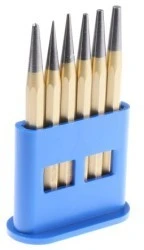 DIN 7255. Wybijak do nitu i zestaw do wybijania środkowego, 6-częściowy. Polerowany stożek Uchwyt ośmiokątny Ø 10 mm, pozłacany Długość narzędzia 120 mm Dostarczany w plastikowym uchwycie. Narzędzia wykonane z chromowanej, wanadowej stali hartowanej powietrzem. Wielowarstwowa powłoka głowicy uderzeniowej praktycznie eliminuje pękanie i pęcznienie.