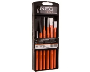 Prezentowany zestaw wybijaków, przecinaków i punktaków to produkt należący do marki NEO firmy TOPEX. Narzędzia znajdujące się w ofercie katalogowej marki wyróżniają się zarówno wysoką jakością, trwałością jak i eleganckim wzornictwem oraz ergonomią. Zawarte w zestawie produkty składają się na podstawowe wyposażenie podczas prac przy zgrubnej obróbce materiałów.