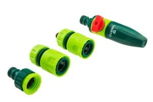 Zestaw ze zraszaczem prostym, złączkami jednomateriałowymi, przyłączem do kranu VERTO (nr ref. 15G711). Zestaw składa się z 4 elementów: zraszacz prosty z blokadą wypływu wody, złączka przelotowa 1/2", złączka stop 1/2", przyłacze do kranu 1/2".