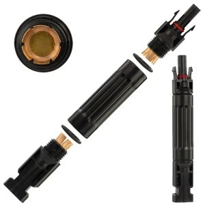 Komplet złącz typu MC4 do łączenia modułów fotowoltaicznych z wbudowanym miejscem do zamontowania wkładki cylindrycznej topikowej 10x38 1000V DC w zakresie 10-32A.