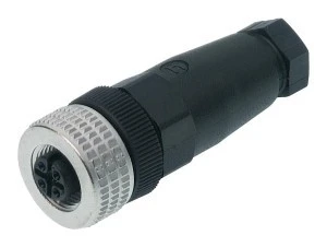 Złącze żeńskie 5-pinowe proste M12. Wtyk kablowy ze stykami pokrytymi cyną, stykiem z PA i obudową Zn Al/Mi, a także O-ring z kauczuku nitrylowego (NBR). Spełnia normy IEC 61076-2-101 i IEC 60947-5-2. Zawiera nośnik styków z klasą palności 94V-2. Odpowiedni do kabli 6 do 8 mm