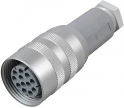 Złącze Żeńskie 12-pinowe proste okrągłe DIN. złącze ze stykiem z Ag i obudową Zn Al/Mi. Spełnia normy IEC 61076-2-101 i IEC 60947-5-2. Zawiera nośnik styków z klasą palności 94V-2. Odpowiedni do kabli 4 do 5 mm