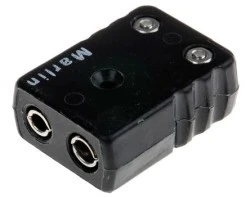 Standardowe złącza z kompensacją. Złącza z kompensacją dla termoelementów typu K i typu J. Termoodporne tworzywo termoplastyczne wzmacniane włóknem szklanym, zdolne utrzymać temperaturę 200 °C. Oznaczenie biegunowości (+ lub -) na złączu. Kołki pełne.