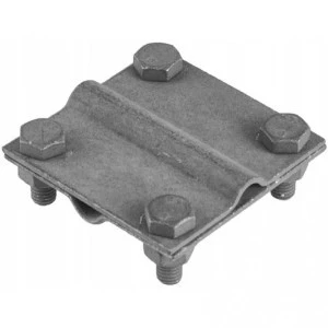 Małe złącze krzyżowe odgromowe Pawbol 55×55 mm z dwiema płytkami i czterema śrubami M8 służy do pewnego łączenia drut–drut, drut–bednarka oraz bednarka–bednarka, dla przewodów o średnicy 8 i 10 mm.