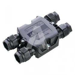 Złącze TEEBOX czterodrożne typu THA.209.A1A jest wyposażone w stopień ochrony IP68, co oznacza pełną odporność na kurz i zanurzenie w wodzie. Posiada obudowę o wymiarach 108mm x 65mm x 28mm, zapewniając kompaktowe rozwiązanie dla połączeń elektrycznych. Wykonane z poliamidu PA66, charakteryzuje się klasą palności V2 według normy UL94, co wskazuje na jego zdolność do samogaszenia.