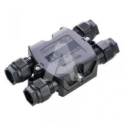 Złącze TEEBOX typu THB.209.A3A to rozgałęźnik czterodrożny z trzema połączeniami, przeznaczony dla przewodów o przekroju do 4 mm². Jego prąd znamionowy wynosi 24 A, a napięcie znamionowe to 450 V. Produkt zapewnia stopień ochrony IP68, co oznacza wysoką odporność na wnikanie pyłu i wody.