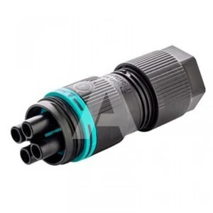 Złącze TEEPLUG mini model THB.387.B4A.L to 4-pinowe gniazdo do przewodów o przekroju od 0,5 do 1,5 mm². Pracuje z prądem znamionowym 17,5 A przy napięciu znamionowym 450 V i posiada stopień ochrony IP68.
