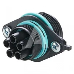 Złącze TEEPLUG mini THB.387.D5A to 5-pinowe gniazdo na panel dla przewodów o przekroju od 0,5 do 2,5 mm². Obsługuje prąd znamionowy 17,5 A przy napięciu znamionowym 450 V i posiada stopień ochrony IP68.