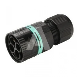 Złącze TEEPLUG mini THB.387.A4A to wtyczka 4-pinowa dla przewodów o przekroju od 0,5 do 1,5 mm². Obsługuje prąd znamionowy 17,5 A przy napięciu znamionowym 450 V, oferując ochronę IP68.