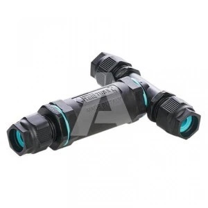 Złącze TEETUBE model THB.402.C1D jest typu "T" z czterema połączeniami dla przewodów o przekroju od 0,5 do 1,5 mm². Pracuje przy prądzie znamionowym 32 A i napięciu znamionowym 450 V, oferując stopień ochrony IP68.