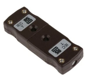 Wtyk miniaturowy z kodem kolorowym RS PRO IEC, wbudowany termowtyk i gniazdo. Z RS PRO para złączy termopary składająca się z miniaturowego wtyku termopary w linii i złącza gniazda termopary. Złącza termopary są idealne do podłączenia sondy termopary lub końcówek przewodów do przedłużacza lub kabli kompensacyjnych, a także do szybkiej, bezpiecznej i bezbłędnej wymiany istniejących termopar. Obudowy złączy są wykonane z wytrzymałego, szklanego tworzywa termoplastycznego, odpornego na uderzenia i odpornego na wysokie temperatury do 220°C. Zaciski wtyczki mają płaską konstrukcję i są polaryzowane, aby zapewnić dokładne połączenie przy połączeniu z gniazdem żeńskim. Obudowy tych miniaturowych złączy termopary są oznaczone kolorami IEC, a typ termopary jest wyraźnie wskazany z przodu, co ułatwia ich identyfikację. Co to jest złącze termopary?. Złącza termopary stanowią dokładny i wygodny sposób połączenia elementów pomiarowych temperatury. Dzięki tym złączom można utworzyć łańcuch od końcówki pomiarowej czujnika temperatury do komputera głównego lub miernika. Ważne jest, aby wszystkie elementy łańcucha były wykonane z tego samego materiału termopary, aby zapobiec jakiejkolwiek zmianie lub zniekształceniu oryginalnego sygnału. Aby to osiągnąć, złącza termopary mają styki wykonane z tego samego materiału, co termopara, które są używane do połączenia lub materiał kompensacyjny. Obudowa złącza posiada rodzaj termopary, na którym jest wyraźnie nadrukowany, a także jest oznaczona kolorami, aby ułatwić identyfikację. Złącze jest otwarte w górę, a przewody termopary są po prostu wkręcone na miejsce za pomocą dwóch zacisków śrubowych. Charakterystyka i zalety. styki wykonane ze stopów termopary lub materiału kompensacyjnego do dokładnego przesyłania sygnału Kolorowe oznaczenia IEC umożliwiają szybką i łatwą identyfikację Zlutowane styki ze stykami płaskimi zapewniające dokładne połączenie Wytrzymałe tworzywo termoplastyczne wykonane ze szkła Wytrzymałość wysokiej temperatury 220°C. Do stosowania z przewodami linkowymi lub litymi Akceptuje się kabel termopary o średnicy do 4 mm Proste złącze zaciskowe do szybkiego montażu biegunowość i typ termopary wyraźnie oznaczone na obudowach. Zastosowania. Miniaturowe wtyczki i gniazda są używane w każdym zastosowaniu, w którym termopary są instalowane, przedłużane lub wymieniane. Ich solidna konstrukcja sprawia, że miniaturowe złącza termopary są idealne do użytku nawet w najbardziej wymagających zastosowaniach pomiarowych temperatury. Akcesoria. Z tym gniazdem termopary można używać zacisku przewodu, patrz numer katalogowy ; 236-4104 236-4104