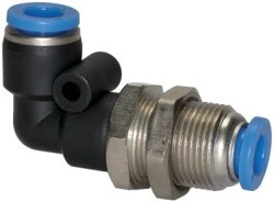 Złączka pneumatyczna wtykowa grodziowa kątowa M22 do węża fi 12 mm, mosiądz niklowany
