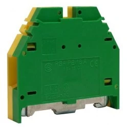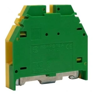 Złączka śrubowa ochronna RSA PE 16 A przeznaczona do łączenia przewodów miedzianych lub aluminiowych o przekroju od 1,5 mm2 do 16 mm2. Złączki są wyposażone w gniazda pomiarowe do kontroli napięcia oraz innych parametrów. Złączki RSA PE są testowane w warunkach klimatycznych do temp. otoczenia od -40 °C do +105 °C i posiadają klasę palności materiału izolacyjnego V0 zgodnie z UL94. Złączki można stosować zgodnie z normą IEC 60947-7-2. Konstrukcja zacisków szeregowych tego typu jest podobna do podstawowych zacisków RSA. Izolowany korpus, w odróżnieniu od podstawowych typów, składa się z dwóch kolorowych części, zielonej i żółtej. Zacisk jest dzięki temu zamknięty z obu stron. Integralność obu części zacisku zapewniają odpowiednie trzpienie lub w ulepszonych typach specjalne zapadki. Połączenie przewodzące z listwą DIN jest zapewnione dzięki stykowi szczękowemu, który dociska się przy pomocy środkowej śruby, umieszczonej pomiędzy bocznymi śrubami, służącymi do dociśnięcia przewodu. W przypadku użycia szyny nośnej jako szyny dla funkcji PEN, konieczne jest spełnienie warunków materiału szyny i przekroju przewodu - szyna musi być wykonana z miedzi, a przekrój przewodu powinien wynosić co najmniej 10 mm2. Listwę stalową, ocynkowaną galwanicznie i pasywowaną chromianem można wykorzystać wyłącznie w funkcji PE.