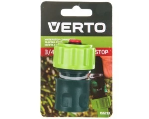 Złączka STOP 3/4" VERTO (nr ref. 15G723). Do wykonania szybkozłącza zastosowano wysokiej jakości tworzywo sztuczne, dlatego element ten będzie służył w bezawaryjny sposób przez długi czas. Dodatkowym atutem szybkozłącza jest to, że posiada ono funkcję stop, która pozwala na wygodne zatrzymanie strumienia wody, bez konieczności zamykania jej ujęcia.