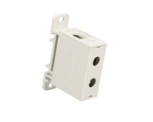 Uniwersalna złączka śrubowa ZGX, jednobiegunowa z dwoma otworami, w kolorze szarym, dla przewodów o przekroju od 1,5 do 50 mm2, w kompaktowej obudowie o małych wymiarach, wykonanej z tworzywa PA6 bez halogenowego, sklasyfikowanego w najwyższym standardzie palności UL V-0 (test pionowego palenia), możliwy montaż złączki zarówno na szynie TH jaki i bezpośrednio na płycie montażowej, z zaciskami na śrubę sześciokątną, które pozwalają na łatwe i mocne dokręcanie przewodu, złączka posiada grawerowaną informacje o: parametrach elektrotechnicznych oraz zalecanych momentach dokręcania. Złączki ZGX są testowane i certyfikowane zgodnie z normą EN 60947-7-1:2012.