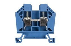 Złączka szynowa gwintowa z obudową w kolorze niebieskim i wykonaniem przeciwwybuchowym 'Eex e'. Umożliwia łączenie w sposób pewny pod względem elektrycznym i mechanicznym przewodów w instalacjach lub urządzeniach elektrycznych. Nadaje się do wykorzystania zarówno w przypadku drutów jak i linek.
