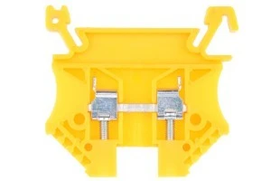 Złączka szynowa gwintowa w kolorze żółtym pochodząca z oferty firmy EM Group, która należy do czołowych dostawców produktów elektroinstalacyjnych. Jej obudowa jest wykonana z tworzywa sztucznego, które znajduje szerokie zastosowanie w elektrotechnice. Do jego właściwości należą odporność termiczna i wytrzymałość na uszkodzenia mechaniczne.