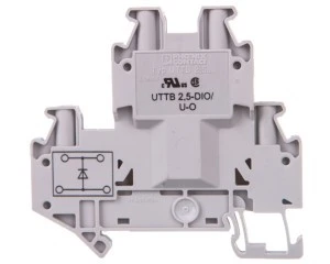 Złącze rzędowe elementów kontr., Prąd maks. określany jest przez diodę. Wbudowane: dioda 1N 4007, napięcie zaporowe: 1300 V, długotrwały prąd graniczny: 0,5 A., z wbudowaną diodą, napięcie znamionowe: 500 V, prąd znamionowy: 24 A, rodzaj przyłącza: Przyłącze śrubowe, Przekrój znamionowy: 2,5 mm², przekrój: 0,14 mm² - 4 mm², rodzaj montażu: NS 35/7,5, NS 35/15, kolor: szary
