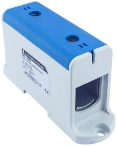 Uniwersalna złączka śrubowa ZGX, jednobiegunowa z dwoma otworami, w kolorze niebieskim, dla przewodów o przekroju od 35 do 240 mm2, w kompaktowej obudowie o małych wymiarach, wykonanej z tworzywa PA6 bez halogenowego, sklasyfikowanego w najwyższym standardzie palności UL V-0 (test pionowego palenia), montaż bezpośrednio na płycie montażowej, z zaciskami na śrubę sześciokątną, które pozwalają na łatwe i mocne dokręcanie przewodu. Złączki ZGX są testowane i certyfikowane zgodnie z normą EN 60947-7-1:2012 oraz EN 61238-1.