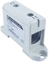Uniwersalna złączka śrubowa ZGX, jednobiegunowa z dwoma otworami, w kolorze szarym, dla przewodów o przekroju od 16 do 95 mm2, w kompaktowej obudowie o małych wymiarach, wykonanej z tworzywa PA6 bez halogenowego, sklasyfikowanego w najwyższym standardzie palności UL V-0 (test pionowego palenia), możliwy montaż złączki zarówno na szynie TH jaki i bezpośrednio na płycie montażowej, z zaciskami na śrubę sześciokątną, które pozwalają na łatwe i mocne dokręcanie przewodu. Złączki ZGX są testowane i certyfikowane zgodnie z normą EN 60947-7-1:2012 oraz EN 61238-1.