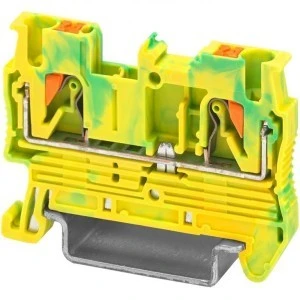 Złączka szynowa ochronna PT 2,5-PE to zacisk przewodu ochronnego PE z przyłączem Push-in dla przewodów o przekroju 0,14–4 mm², przystosowany do pracy przy prądzie do 24 A i montażu na szynach DIN NS 35/7,5 oraz NS 35/15.