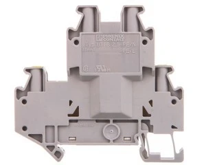 Złącze dwupoziomowe przewodu ochronnego, napięcie znamionowe: 500 V, prąd znamionowy: 24 A, rodzaj przyłącza: Przyłącze śrubowe, Przekrój znamionowy: 2,5 mm², przekrój: 0,14 mm² - 4 mm², rodzaj montażu: NS 35/7,5, NS 35/15, kolor: szary