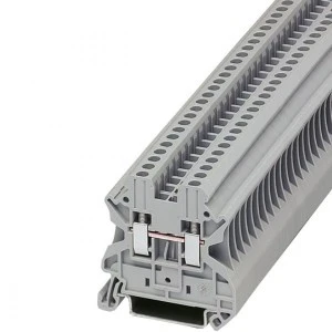 Złączka szynowa przelotowa UT 2,5 to 1-torowa złączka śrubowa na szynę DIN TH-35, przystosowana do pracy przy napięciu do 1000 V i prądzie 24 A dla przekrojów przewodów 0,14–4 mm².