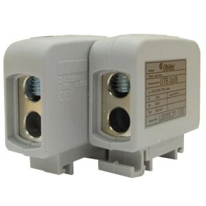 Złączka uniwersalna (Al/Cu) UTB 2x35 w kolorze szarym. Dwa połączenia wejściowe i wyjściowe dla przewodów aluminiowych i miedzianych o przekroju od 6 mm2 do 35 mm2. Korpus złączki UTB wykonany jest z elektroprzewodzącego aluminium z powłoką galwaiczną, co zapewnia bezkolizyjne połączenie przewodów aluminiowych i miedzianych w jednym zacisku. W celu bezpiecznego łączenia jednodrutowych przewodów aluminiowych, część zaciskowa przewodu powinna być wypełniona specjalną pastą stykową, która rozbija warstwę oksydacyjną, zapobiega korozji elektrolitycznej i zapewnia długotrwałą ochronę. Główną zaletą złączki UTB jest duża zmienność połączeń z możliwością rozgałęzienia. Wymiary złączki są stosunkowo niewielkie, ponieważ gniazda przyłączeniowe są umieszczone jedno nad drugim, co zwiększa liczbę zacisków w rzędzie przy zachowaniu tego samego rozstawu szyn zaciskowych. Złączkę można mocować do szyny montażowej TH 35. Temperatura pracy złączek UTB wynosi od -25 °C do +100°C. Materiał obudowy poliamid PA. Złączka testowana zgodnie z IEC 60947-7-1.