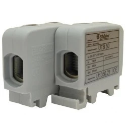 Złączka uniwersalna (Al/Cu) UTB 50 w kolorze szarym nadaje się do wszystkich rodzajów przewodów aluminiowych i miedzianych o przekroju od 1,5 mm2 do 50 mm2. Korpus złączki UTB wykonany jest z elektroprzewodzącego aluminium z powłoką galwaiczną, co zapewnia bezkolizyjne połączenie przewodów aluminiowych i miedzianych w jednym zacisku. W celu bezpiecznego łączenia jednodrutowych przewodów aluminiowych, część zaciskowa przewodu powinna być wypełniona specjalną pastą stykową, która rozbija warstwę oksydacyjną, zapobiega korozji elektrolitycznej i zapewnia długotrwałą ochronę. Główną zaletą złączki UTB jest duża zmienność połączeń z możliwością rozgałęzienia. Wymiary złączki są stosunkowo niewielkie, ponieważ gniazda przyłączeniowe są umieszczone jedno nad drugim, co zwiększa liczbę zacisków w rzędzie przy zachowaniu tego samego rozstawu szyn zaciskowych. Złączkę można mocować do szyny montażowej TH 35. Temperatura pracy złączek UTB wynosi od -25 °C do +100°C. Materiał obudowy poliamid PA. Złączka testowana zgodnie z IEC 60947-7-1.