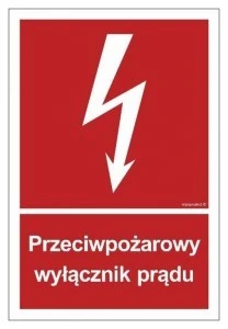 Znak PPOŻ „Przeciwpożarowy wyłącznik prądu”Znak PPOŻ „Przeciwpożarowy wyłącznik prądu” jest przeznaczony do oznaczenia wyłącznika odpowiadającego za odcięcie dopływu prądu. Wykorzystuje się go w budynkach użytku publicznego. Znak „Przeciwpożarowy wyłącznik prądu” jest zgodny z najnowszą, europejską normą. Wyróżnia się czerwonym tłem i piktogramem błyskawicy. Widoczny jest na nim również napis „Przeciwpożarowy wyłącznik prądu”. Znak wykonany jest na następujących podłożach: • folia samoprzylepna fotoluminescencyjna – arkusz 9 naklejek • folia samoprzylepna – arkusz 9 naklejek • folia samoprzylepna fotoluminescencyjna• folia samoprzylepna• płyta sztywna 1mm• płyta sztywna 1mm fotoluminescencyjna• płyta TD fotoluminescencyjna• folia podłogowa• folia podłogowa fotoluminescencyjnaZnak „Przeciwpożarowy wyłącznik prądu” może być w formacie: 5 x 7,4 cm, 10 x 14,8 cm, 15 x 22,2 cm, 20 x 29,6 cm, 25 x 37 cm, 35 x 51,8 cm, 40 x 59,4 cm i 50 x 74 cm.