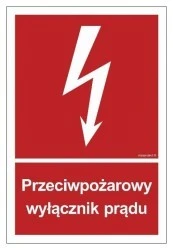 Znak PPOŻ „Przeciwpożarowy wyłącznik prądu”Znak PPOŻ „Przeciwpożarowy wyłącznik prądu” jest przeznaczony do oznaczenia wyłącznika odpowiadającego za odcięcie dopływu prądu. Wykorzystuje się go w budynkach użytku publicznego. Znak „Przeciwpożarowy wyłącznik prądu” jest zgodny z najnowszą, europejską normą. Wyróżnia się czerwonym tłem i piktogramem błyskawicy. Widoczny jest na nim również napis „Przeciwpożarowy wyłącznik prądu”. Znak wykonany jest na następujących podłożach: • folia samoprzylepna fotoluminescencyjna – arkusz 9 naklejek • folia samoprzylepna – arkusz 9 naklejek • folia samoprzylepna fotoluminescencyjna• folia samoprzylepna• płyta sztywna 1mm• płyta sztywna 1mm fotoluminescencyjna• płyta TD fotoluminescencyjna• folia podłogowa• folia podłogowa fotoluminescencyjnaZnak „Przeciwpożarowy wyłącznik prądu” może być w formacie: 5 x 7,4 cm, 10 x 14,8 cm, 15 x 22,2 cm, 20 x 29,6 cm, 25 x 37 cm, 35 x 51,8 cm, 40 x 59,4 cm i 50 x 74 cm.