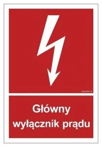 Znak Główny wyłącznik prądu Znak Główny wyłącznik prądu jest znakiem PPOŻ, przeznaczonym do oznaczenia miejsca, gdzie znajduje się główny wyłącznik prądu umożliwiający odłączenie całej instalacji elektrycznej. Ma to zapewnić większe bezpieczeństwo osobom przebywającym w budynku na wypadek wybuchu pożaru czy też zagrożenia pożarowego. Znak Główny wyłącznik prądu ma czerwone tło, na którym znajduje się jasny piktogram błyskawicy oraz napis „Główny wyłącznik prądu”. Znak Główny wyłącznik prądu jest dostępny w kilku wariantach. Do wyboru są następujące formaty:• 5 x 7,4 cm• 10 x 14,8 cm• 15 x 22,2 cm• 20 x 29,6 cm• 25 x 37 cm• 35 x 51,8 cm• 40 x 59,4 cm• 50 x 74 cmZnak Główny wyłącznik prądu wykonany jest również na kilku podłożach: • Folia samoprzylepna• Folia samoprzylepna fotoluminescencyjna• Płyta sztywna 1 mm • Płyta sztywna 1 mm fotoluminescencyjna• Płyta TD fotoluminescencyjna• Folia podłogowa• Folia podłogowa fotoluminescencyjna