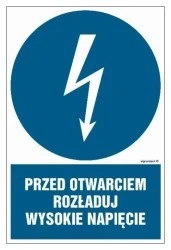 ZNAK ‑ HE006 Przed otwarciem rozładuj wysokie napięcie 30 x 45 cm PN ‑ Płyta 1mm