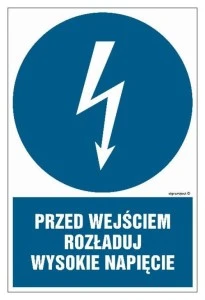 ZNAK ‑ HE007 Przed wejściem rozładuj wysokie napięcie 50 x 75 cm PN ‑ Płyta 1mm