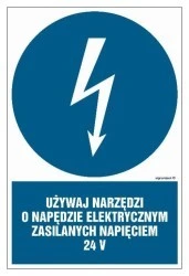 ZNAK ‑ HE016 Używaj narzędzi o napędzie elektrycznym zasilanym napięciem 24V 35 x 52,5 cm PN ‑ Płyta 1mm