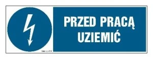 ZNAK ‑ HF005 Przed pracą uziemić 20 x 6,7 cm FN ‑ Folia samoprzylepna