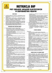 Instrukcja BHP przy obsłudze urządzeń elektrycznych w gospodarstwie rolnym jest zbiorem reguł, do których należy się stosować podczas korzystania z urządzeń elektrycznych, które są wykorzystywane w gospodarstwie rolnym. Znalazła ona swoje zastosowanie zarówno w dużych, jak i małych zakładach przeznaczonych m.in. do uprawy czy też przetwórstwa i składowania zboża. Instrukcja BHP przy obsłudze urządzeń elektrycznych w gospodarstwie rolnym podzielona jest na 4 rozdziały, z których każdy dotyczy innego, konkretnego zagadnienia. Pod tekstem jest miejsce na podpis osoby zatwierdzającej.