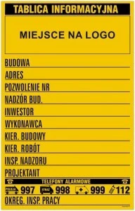 Budowlana tablica informacyjna z miejscem na logo Budowlana tablica informacyjna z miejscem na logo przeznaczona jest do użytku zewnętrznego na placach budowy. Jest w kolorze żółtym z czarnymi napisami. Budowlana tablica informacyjna z miejscem na logo jest do samodzielnego uzupełnienia. Znajduje się na niej miejsce na: rodzaj budowy, adres, nr pozwolenia, dane osoby nadzorującej budowę, inwestora, wykonawcy, kierownika budowy, kierownika robót, inspektora nadzoru i projektanta. Ponadto na górze jest miejsce na logo. Budowlana tablica informacyjna jest w rozmiarze 70 x 110 cm. Dostępna jest w dwóch wariantach. Może być wykonana z płyty żółtej 0,6 mm lub też blachy ocynkowanej. Oba materiały są trwałe i odporne na niekorzystny wpływ czynników zewnętrznych, dzięki czemu budowlana tablica informacyjna z miejscem na logo jest solidna i zachowuje swój pierwotny wygląd przez długi czas użytkowania.