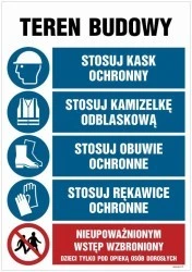 Tablica Teren Budowy, stosuj kask ochronny…Tablica budowlana Teren Budowy z informacjami dotyczącymi prawidłowego zachowania i postępowania w trakcie przebywania na wyznaczonym obszarze. Tablica Teren Budowy zawiera kilka znaków informacyjnych: • Stosuj kask ochronny• Stosuj kamizelkę odblaskową• Stosuj obuwie ochronne• Stosuj rękawice ochronne Dodatkowo Tablica Teren Budowy zawiera jeden znak zakazu: Nieupoważnionym wstęp wzbroniony. Dzieci tylko pod opieką osób dorosłych. Poszczególne znaki są w postaci piktogramów i dodatkowo posiadają wyjaśnienie opisowe. Tablica Teren Budowy jest w rozmiarze 70 x 105 cm. Wykonana jest na folii samoprzylepnej, płycie sztywnej 1 mm lub blasze ocynkowanej do wyboru. Zawsze powinna znajdować się w widocznym i łatwo dostępnym dla każdego miejscu.