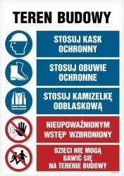 ZNAK - OI023 Teren budowy, Stosuj kask ochronny, Zakaz przebywania osób nieupoważnionych, Stosuj obuwie ochronne, 100 x 75 cm PN