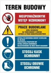 ZNAK - OI023 Teren budowy, Stosuj kask ochronny, Zakaz przebywania osób nieupoważnionych, Stosuj obuwie ochronne, 100 x 75 cm PN