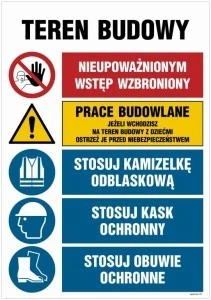 Znak Teren budowy, Nieupoważnionym wstęp wzbroniony, Prace budowlane jest przeznaczony do wykorzystania w miejscu prowadzonych prac budowlanych. Zastępuje on kilka znaków, wśród których są znaki zakazu, ostrzegawcze i informacyjne. Znak Teren budowy składa się z kilku znaków, a dokładnie: