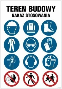 ZNAK - OI023 Teren budowy, Stosuj kask ochronny, Zakaz przebywania osób nieupoważnionych, Stosuj obuwie ochronne, 100 x 75 cm PN