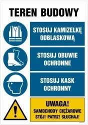 ZNAK - OI023 Teren budowy, Stosuj kask ochronny, Zakaz przebywania osób nieupoważnionych, Stosuj obuwie ochronne, 100 x 75 cm PN